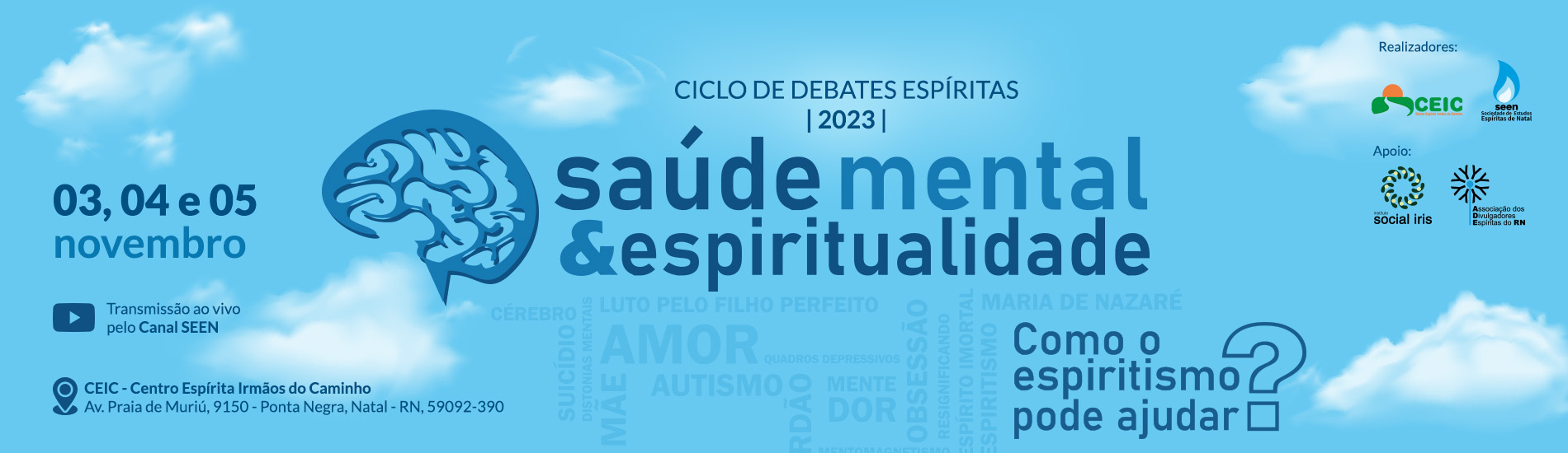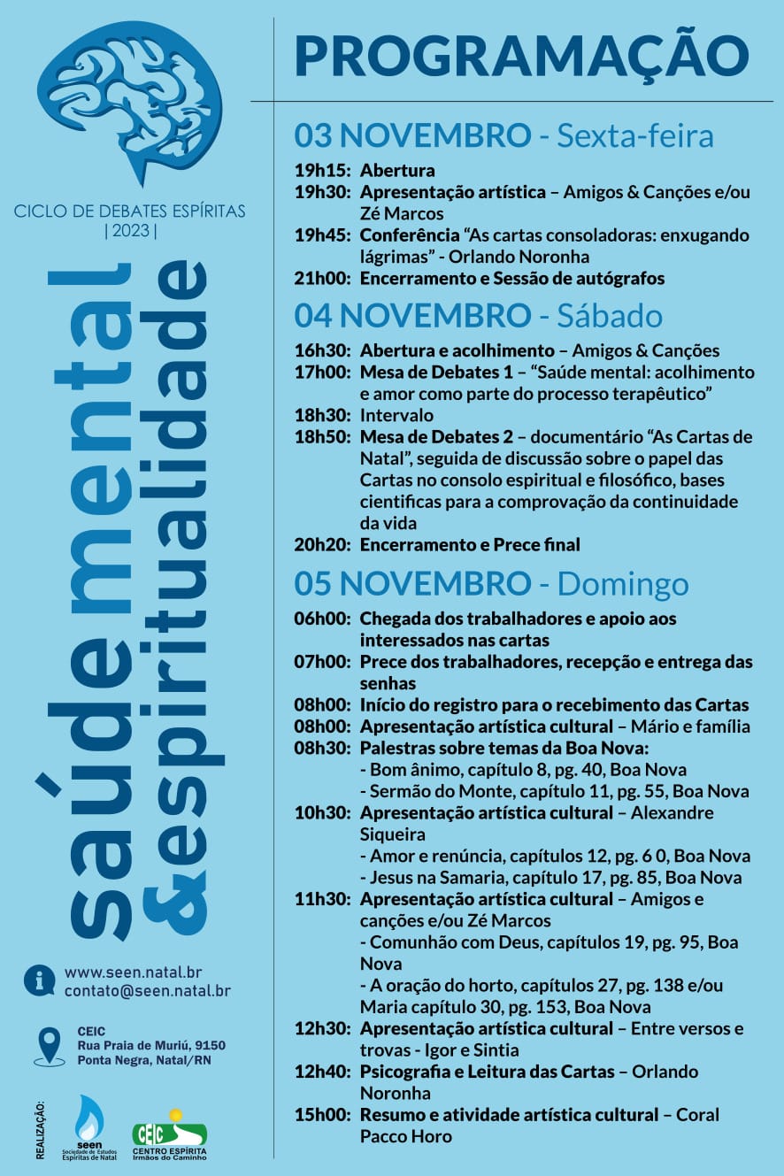 A Sociedade de Estudos Espíritas de Natal (SEEN) e o Centro Espírita Irmãos do Caminho (CEIC) convidam você e sua família a participar do Ciclo de Debates Espíritas de Natal - Edição 2023, com o tema central: "Saúde Mental e Espiritualidade". O evento acontecerá de forma presencial nos dias 03, 04 e 05 de novembro no CEIC (Av. Praia de Muriú, 9150 - Ponta Negra, Natal - RN, 59092-390), também será transmitido ao vivo no nosso canal.